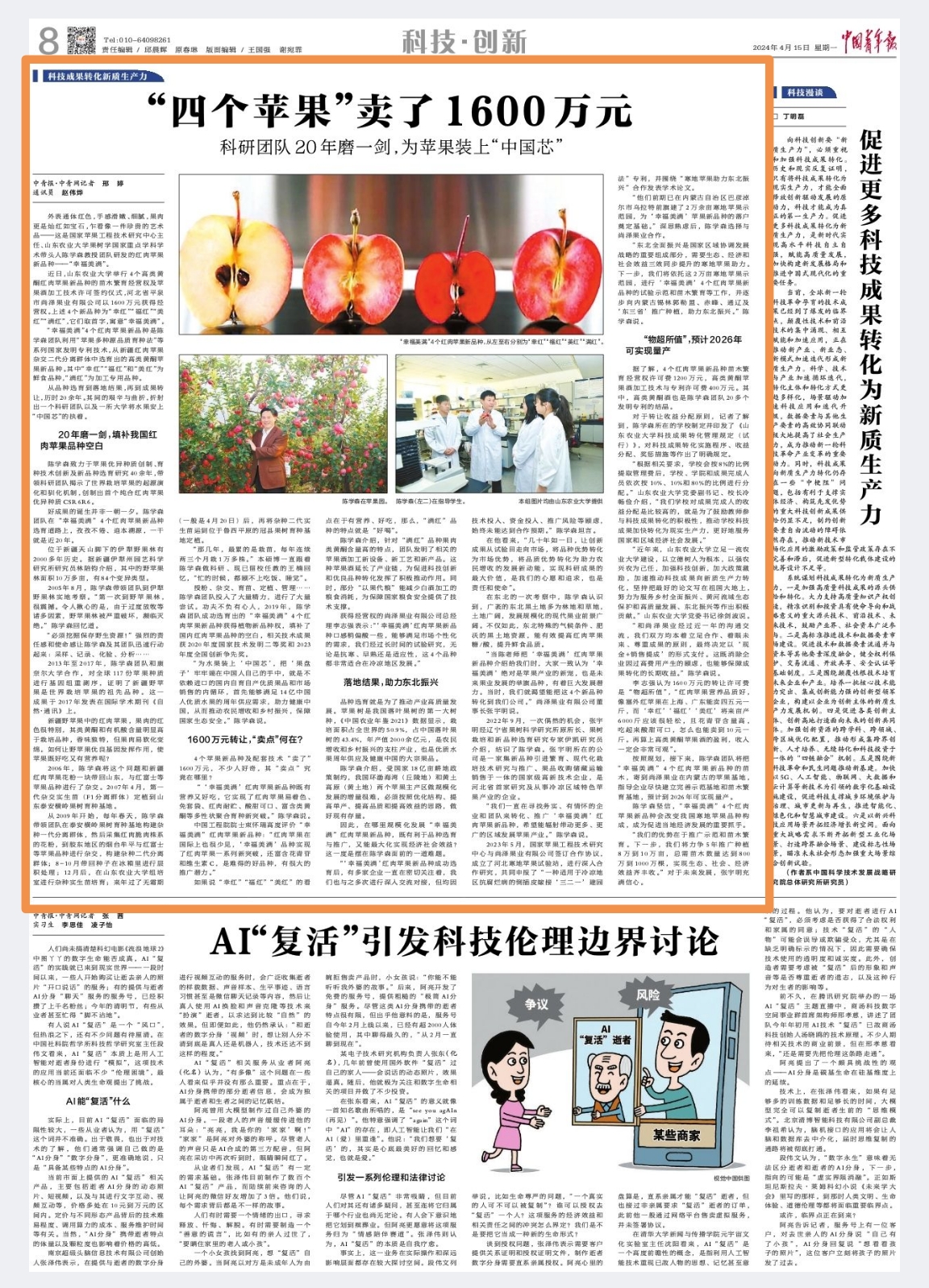 • 近日,山東農業大學舉行4個高類黃酮紅肉蘋果新品種的苗木繁育經營權及蘋果酒加工技術許可簽約儀式,河北省平泉市尚澤果業有限公司以1600萬元獲得經營權。上述4個新品種為“幸紅”“福紅”“美紅”“滿紅”,它們取首字,寓意“幸福美滿”。