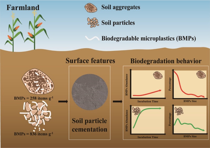 • 近日,資源與環境學院李成亮教授團隊在Journal of Hazardous Materials發表了題為“Novel insight into the in-situstudy of biodegradable microplastics in soil aggregates”的研究論文。山東農業大學李成亮教授為論文通訊作者,博士研究生張銘谷為論文第一作者,山東農業大學為論文第一完成單位。隨著可降解塑料作為傳統塑料的替代品被越來越多的使用,可降解塑料在環境中的降解行為與生態風險日益受到關注。相較于傳統塑料,可降解塑料在土壤中的不完全降解會導致更嚴重的微塑料污染。然而,目前關于可降解塑料在土壤中的降解行為仍然缺乏系統研究。因此,本研究通過田間原位降解實驗,探討了可降解微塑料(BMPs)在土壤團聚體中的表面特征和生物降解行為。研究結果表明,與土壤顆粒相比,BMPs在土壤團聚體中的生物破碎過程更為緩慢。團聚體的包埋作用阻礙了小尺寸BMPs的遷移,導致其在團聚體內部分布比例顯著偏高。在BMPs生物降解過程中,聚合物分子層面結構發生變化,形成了高度交聯的BMPs殘留物,導致BMPs在土壤中長期