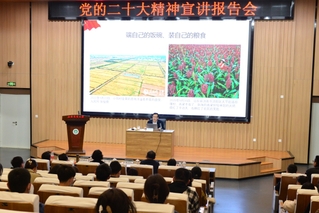 • 11月16日上午,學校舉辦黨的二十大精神宣講報告會暨宣講啟動儀式。山東農業大學黨的二十大精神宣講團團長、黨委書記徐劍波以“學習宣傳貫徹黨的二十大精神 爭做知農愛農強農興農時代新人”為題,為學校師生代表作宣講報告。黨委副書記張然主持報告會。徐劍波指出,黨的二十大是在全黨全國各族人民邁上全面建設社會主義現代化國家新征程、向第二個百年奮斗目標進軍的關鍵時刻召開的一次十分重要的大會,為新時代新征程黨和國家事業發展、實現第二個百年奮斗目標指明了前進方向、確立了行動指南。徐劍波從深入學習宣傳貫徹黨的二十大精神、中國共產黨領導“三農”工作的百年演進、習近平總書記關于“三農”工作的重要論述和爭做知農愛農強農興農時代新人四個方面作了宣講報告。徐劍波指出,黨的二十大回顧總結了過去5年的工作和新時代10年的偉大變革,闡述了開辟馬克思主義中國化時代化新境界、中國式現代化的中國特色和本質要求等重大問題,對全面建設社會主義現代化國家、全面推進中華民族偉大復興進行了戰略謀劃,對統籌推進“五位一體”總體布局、協調推進“四個全面”戰略布局作出了全面部署,對于動員全黨全國各族人民更加緊密地團結在以習近平同志為核心的黨中央