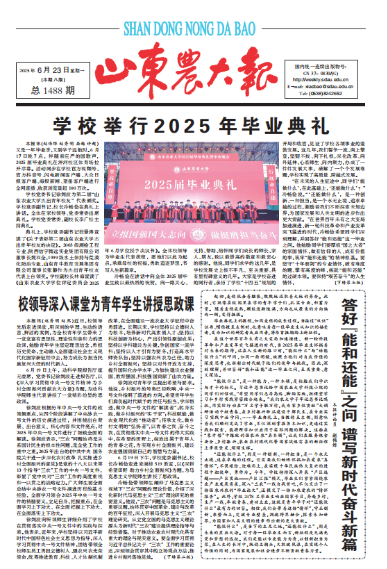 • 8月23日至24日,中國共產黨山東省第十二屆委員會第七次全體會議在濟南舉行。全會聽取和討論了省委常委會工作報告,審議通過了《中共山東省委關于深入貫徹落實黨的二十屆三中全會精神在進一步全面深化改革上當好排頭兵的意見》,著力將“排頭兵”打造成新征程上山東改革最顯著的標識、最有力的指引,全省廣大干部黨員群眾表示,要堅定扛牢“走在前 挑大梁”的使命擔當,銳意進取,改革創新,以一域之光為全局添彩。8月25日,《山東新聞聯播》以“當好改革排頭兵 以一域之光為全局添彩”為題,對我校深化教育綜合改革進行報道,報道如下:黨委書記徐劍波在接受采訪時指出,省委十二屆七次全會對深入學習貫徹黨的二十屆三中全會精神作出部署,我們將切實抓好貫徹落實,堅定扛牢“走在前、挑大梁”的使命擔當,勇當全面深化改革尖兵,為全力沖擊國家一流學科蓄勢賦能。一是深化人才培養模式改革,構建頂天立地新農人的全鏈條培育體系,堅持“五育并舉”,落實立德樹人根本任務,著力造就拔尖創新人才。二是深化科技體制機制改革,構建重大原始創新成果的全周期產出機制,堅持目標導向、問題導向和結果導向,加強有組織科研,為培育壯大農業新質生產力注入“源頭活水”。