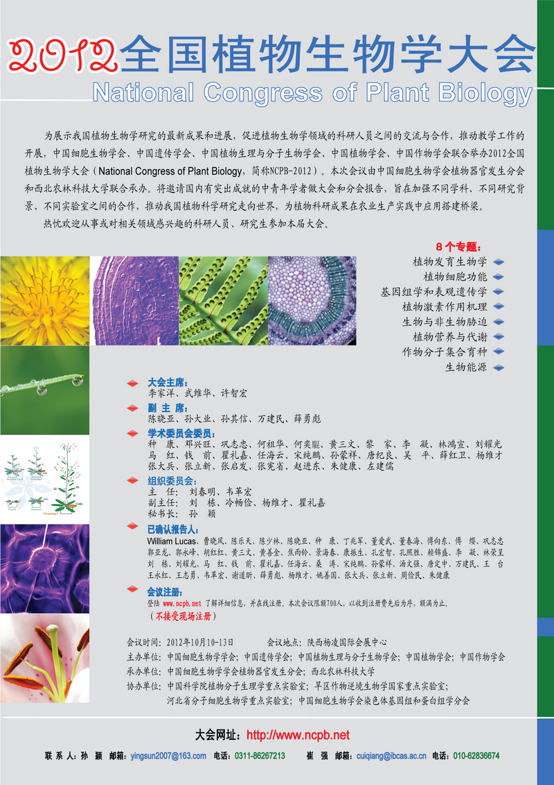 為展示我國植物生物學研究的最新成果和進展,促進我國植物生物學各相關(guān)研究領(lǐng)域的科研人員之間的交流與合作,推動教學工作的開展,中國細胞生物學會、中國遺傳學會、中國植物生理學會、中國植物學會和中國作物學會將于2012年10月10-13日聯(lián)合舉辦“2012全國植物生物學大會”。 大會將邀請相關(guān)領(lǐng)域?qū)<覍W者做學術(shù)報告,研討和交流植物分子生物學和現(xiàn)代農(nóng)業(yè)研究的最新成果。熱誠歡迎并邀請國內(nèi)外同行參加研討會。會議詳情請登陸大會網(wǎng)址:www.ncpb.net。