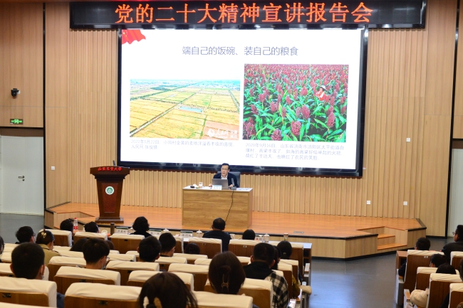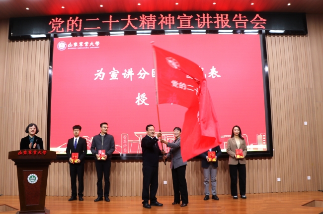 11月16日上午,學校舉辦黨的二十大精神宣講報告會暨宣講啟動儀式。山東農業大學黨的二十大精神宣講團團長、黨委書記徐劍波以“學習宣傳貫徹黨的二十大精神 爭做知農愛農強農興農時代新人”為題,為學校師生代表作宣講報告。黨委副書記張然主持報告會。