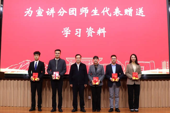 宣講報告前,徐劍波為學校五個宣講分團的師生代表贈送學習資料,并為宣講團授旗。宣講結束后,徐劍波還與學生代表進行了互動交流。