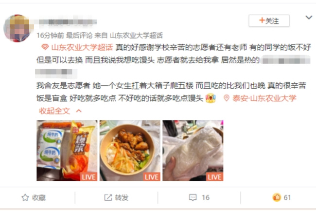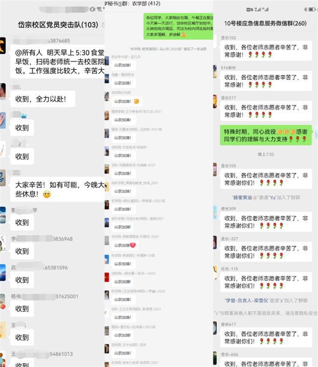 面對疫情,學生們團結一致,為農大加油吶喊,展現出農大學子的風采。他們按照學校要求,第一時間做到“足不出戶(宿舍)”,積極配合進行核酸檢測,沒有任何怨言,沒有絲毫慌亂。各個學院的學生微信群里,“山農加油!”的呼聲在屏幕中不停閃現。“老師,我們知道學校疫情防控不容易,我們也想為學校抗疫貢獻力量。老師,如果有需要請及時聯系我們,我們永遠站在學校身后。”動科學院2021級碩士研究生李曉敏誠摯地向輔導員老師表達為學校作貢獻的想法。與學校共進退,與疫情作斗爭,農大校園里精誠團結、共同奮斗的青春力量,讓人為之深深動容。