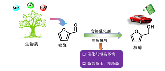 糠醛作為重要的生物質衍生物,可以通過催化加氫反應制備出各種高附加值的化學品。其中,工業上由糠醛制糠醇通常采用鉻酸銅(CuCr2O4)作為催化劑,在高壓氫氣條件下進行,該方法面臨著諸多問題(圖1)。因此急需發展綠色高效的方式,實現糠醛選擇性加氫制備糠醇。