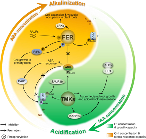 富含亮氨酸重復序列類受體蛋白激酶TMK與FER通過磷酸化位于質膜的質子泵AHA2,從而控制H+的流動,以達到酸化與堿化的平衡。生長素對植物生長具有“低促高抑”現象,TMK作為生長素質膜上的受體,可維持植物體內合適的生長素濃度以促進生長。當高濃度生長素出現時,TMK通過磷酸化ABI2以開啟ABA信號,低濃度的ABA可以促進植物的生長,而隨著ABA濃度升高又會促進FER的磷酸化能力,抑制植物的酸性生長和生長素信號,以達到植物體內生長素和脫落酸平衡。“酸化和堿化平衡”、“生長素和脫落酸平衡”最終組成植物生長發育與逆境脅迫之間TMK-FER的動態平衡,且符合中國陰陽平衡的哲學理論。