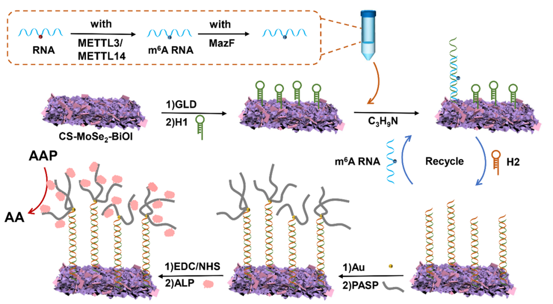 近日,化學與材料科學學院周云雷副教授團隊在分析領域國際知名期刊《Biosensors and Bioelectronics》在線發表了題為“Antibody-free photoelectrochemical strategy for simultaneous detection of methylated RNA, METTL3/METTL14 protein and MazF protein based on enhanced photoactivity of MoSe2-BiOI nanocomposite”的研究論文。碩士研究生崔曉婷為該論文的第一作者,周云雷副教授和殷煥順教授為該論文的通訊作者。