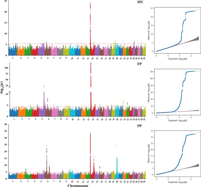 圖1. 產奶量、乳脂率和乳蛋白率縱向全基因組關聯分析的曼哈頓圖和QQ圖