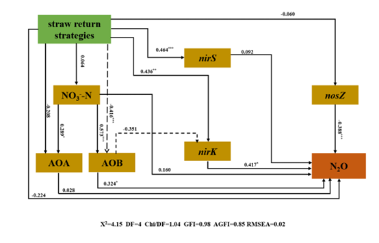結(jié)構(gòu)方程模型(SEM)表明秸稈還田通過影響AOB-amoA基因、nirK基因和nosZ基因進(jìn)而間接影響N2O釋放。