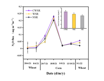 秸稈還田顯著影響N2O排放。與不還田(NSR)相比,小麥和玉米秸稈還田(CWSR)以及僅小麥秸稈還田(WSR)的N2O排放總量顯著增加了31.74%和12.37%。