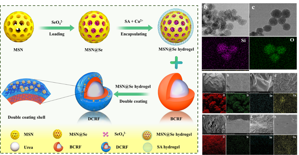 針對上述問題,楊越超教授團(tuán)隊(duì)制備了一種多功能雙層生物基包膜控釋肥,該肥料同時(shí)具備緩釋氮、硒和銅元素的能力。該肥料為以尿素作為肥料的核心,生物基聚氨酯作為內(nèi)涂層,藻酸鈉和銅離子形成水凝膠作為外涂層制備而來。此外,負(fù)載硒酸鈉的介孔二氧化硅納米顆粒被用于修飾海藻酸鈉水凝膠(MSN@Se水凝膠)。