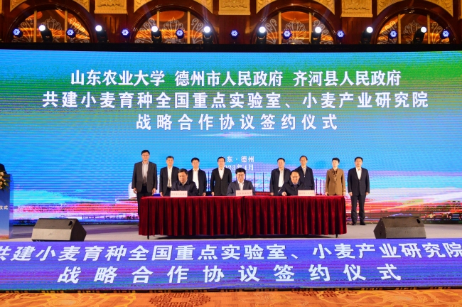 4月17日,山東農業大學與德州市人民政府、齊河縣人民政府共建小麥育種全國重點實驗室、小麥產業研究院戰略合作協議簽約儀式在德州舉行。