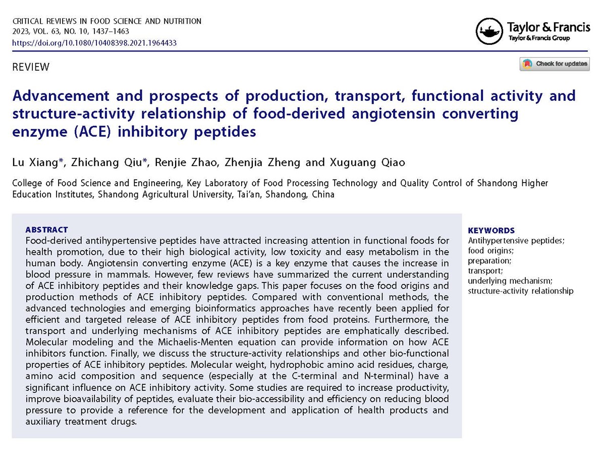近日,山東農業大學食品科學與工程學院喬旭光教授研究團隊在Critical Reviews in Food Science and Nutrition發表了題為“Advancement and prospects of production, transport, functional activity and structure-activity relationship of food-derived angiotensin converting enzyme (ACE) inhibitory peptides”的論文,系統闡述了ACE抑制肽的來源、制備方法、體內轉運以及潛在機制的最新研究進展,此外還對目前ACE抑制肽在食品開發和利用中存在的局限以及解決措施進行了總結,為保健品和輔助治療藥物的開發和應用提供參考。博士研究生項璐和邱志常博士為共同第一作者,喬旭光教授和鄭振佳副教授為本文的共同通訊作者。