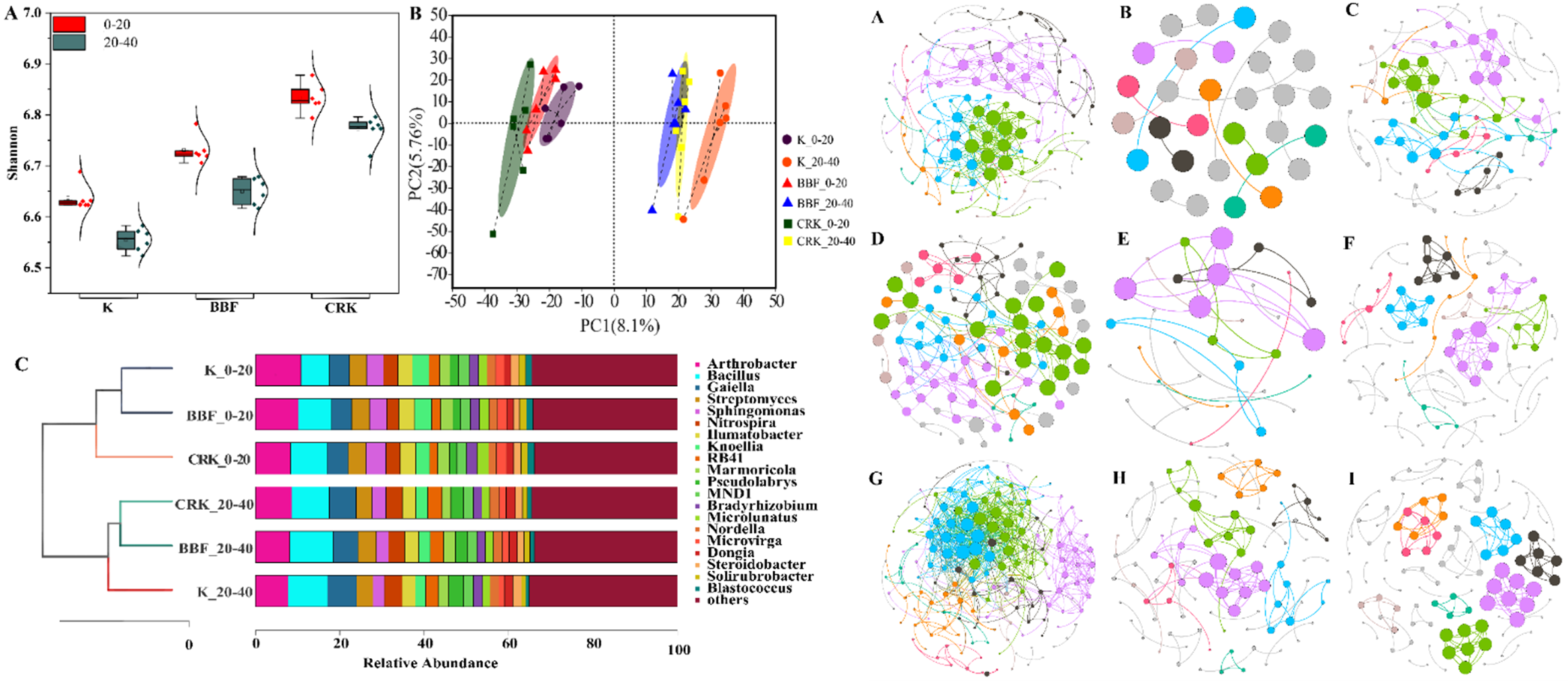 圖1. 控釋氯化鉀對土壤細菌群落多樣性及相對豐度、共生網絡的影響