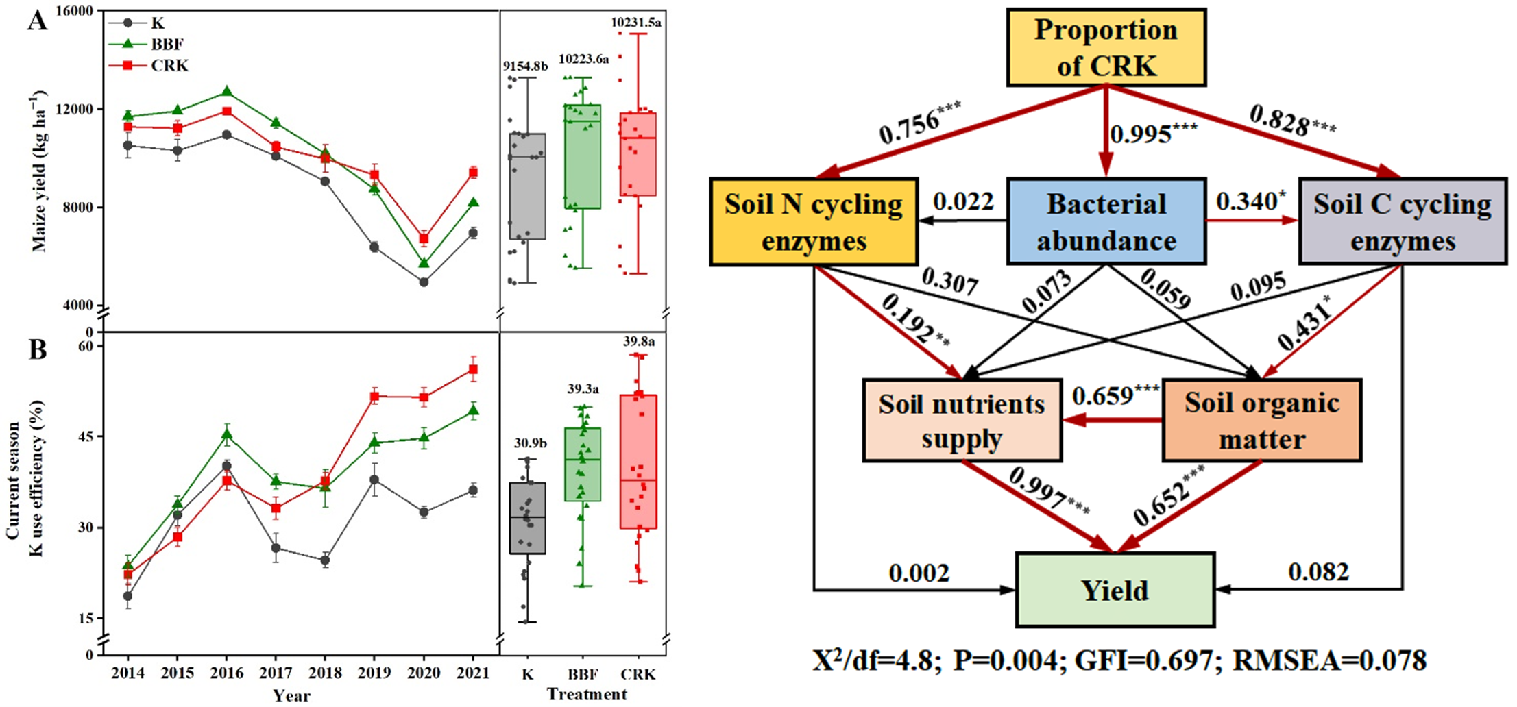 圖2. 施用控釋氯化鉀對土壤細菌生態和玉米產量影響的結構方程模型分析