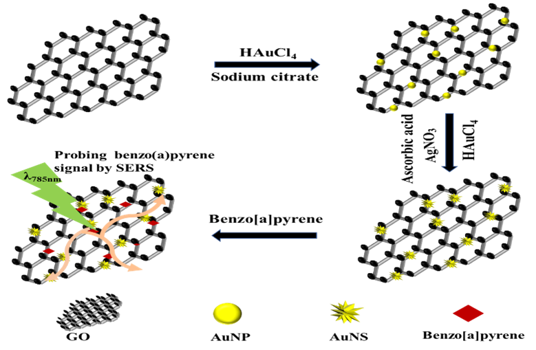 還原氧化石墨烯具有類似于石墨烯的性質(zhì),包括極高的比表面積,豐富的多芳烴結(jié)構(gòu)域和出色的吸附能力,在SERS領(lǐng)域是一種非常有應(yīng)用前景的基底材料。通過π-π堆積與疏水相互作用,還原氧化石墨烯可以作為芳香族分子的捕獲平臺(tái),金納米星具有豐富的尖銳樹枝狀納米結(jié)構(gòu),可以產(chǎn)生強(qiáng)烈的SERS“熱點(diǎn)”效應(yīng)。苯并[a]芘等芳香族分子中缺少親和金屬的官能團(tuán),對(duì)Au和Ag等貴金屬表現(xiàn)出非常差的親和力。通過種子介導(dǎo)生長(zhǎng)法在還原氧化石墨烯表面合成金納米星,通過還原氧化石墨烯的吸附作用使苯并[a]芘分子接近金納米星表面,借助金納米星的表面等離子體共振效應(yīng)獲得增強(qiáng)的苯并[a]芘SERS信號(hào)。