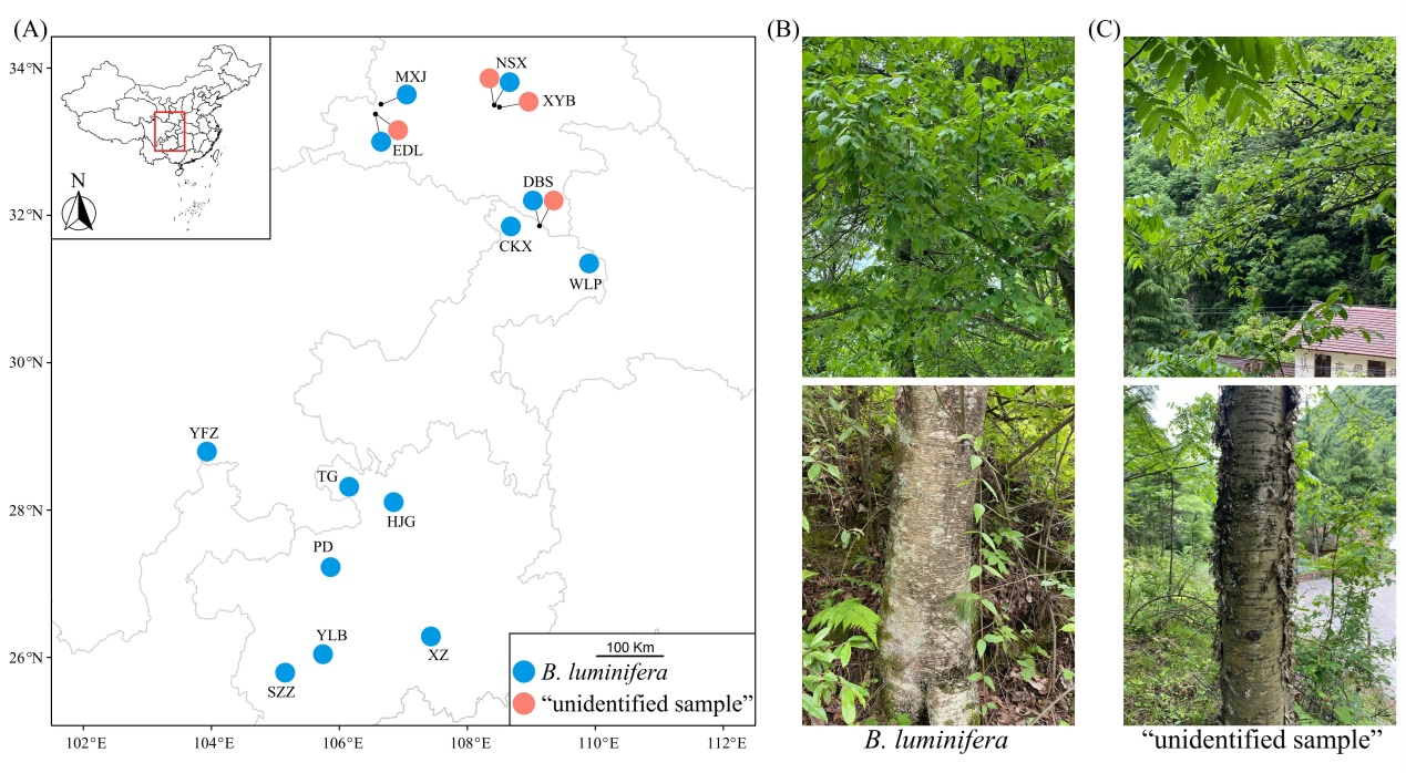 樺木屬(BetulaL.)廣泛分布于北半球,具有重要的經濟價值和生態價值。然而由于頻繁的種間雜交、多倍化以及廣泛的形態變異,樺木屬分類極其困難。作者自2017年在秦嶺大巴山發現一些樺木個體,其葉及果實形態與同域分布的亮葉樺(B. luminifera)難以區分;然而這些個體樹皮呈條狀剝落而亮葉樺樹皮光滑。作者把這些樺木初步命名為“未鑒定物種”(“unidentified sample”)(圖1)。