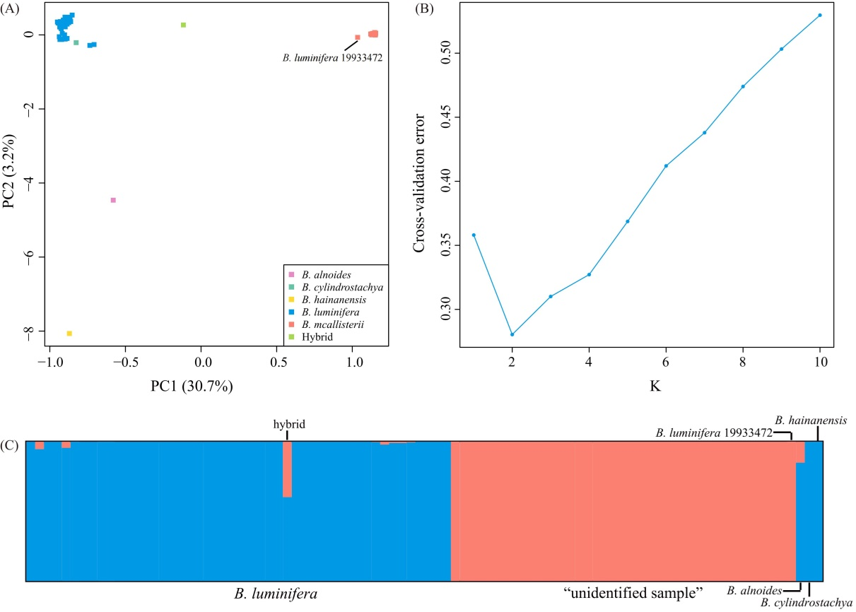圖2. 基于RADseq的PCA分析(A)、最佳K值及Admixture分析(C)