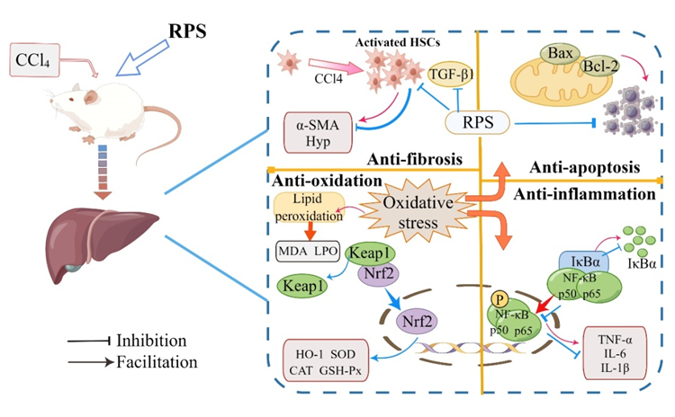 我們基于體內構建慢性肝損傷小鼠模型探索了RPS對肝損傷的修復機制。結果表明,RPS能夠協同調節Nrf2、NF-κB、Bcl-2/Bax等通路,改善機體的氧化應激水平,抑制炎癥因子的過度釋放,抑制多種纖維化因子的高表達,通過發揮抗氧化、抗炎、抗凋亡和抗纖維化等作用,顯示出較好的抗慢性肝損傷的作用。該研究為天然保肝藥物的開發,以及促進我國食用菌產業的進一步發展提供了一定的參考意義。