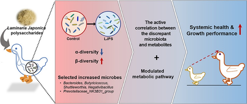 海藻多糖是一種具有多種生物學活性的生物大分子,但其用于養殖業對改善動物健康、提高生長性能的效果及機制仍不明確。該研究證實了海藻多糖能夠提高肉鴨生產性能和系統健康,其作用機制在于海藻多糖通過靶向調控腸道微生物及其代謝組,從而上調了生長相關的代謝通路,實現了對動物生長的調控。研究也進一步驗證了,大分子植物多糖通過“多糖-腸道微生物/代謝組-宿主表型”軸實現對宿主表型和生理健康影響的機制。這位今后利用植物多糖開展對腸道微生物的靶向調控而實現對動物生長性能、產品品質或疾病的調控和治療提供了新的思路。