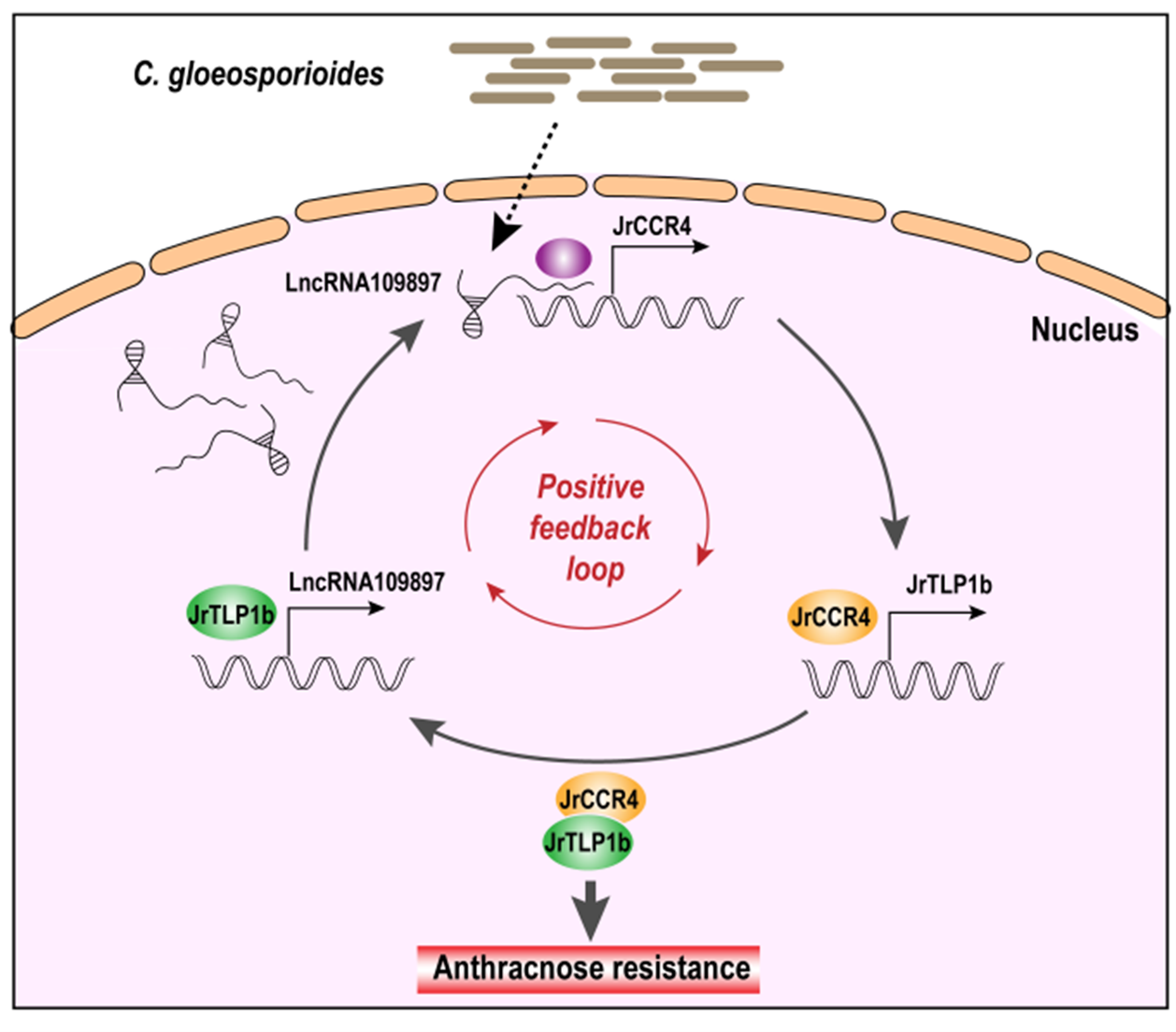 圖1. 分子模塊 LncRNA109897-JrCCR4-JrTLP1b 調(diào)控核桃對炭疽病抗性