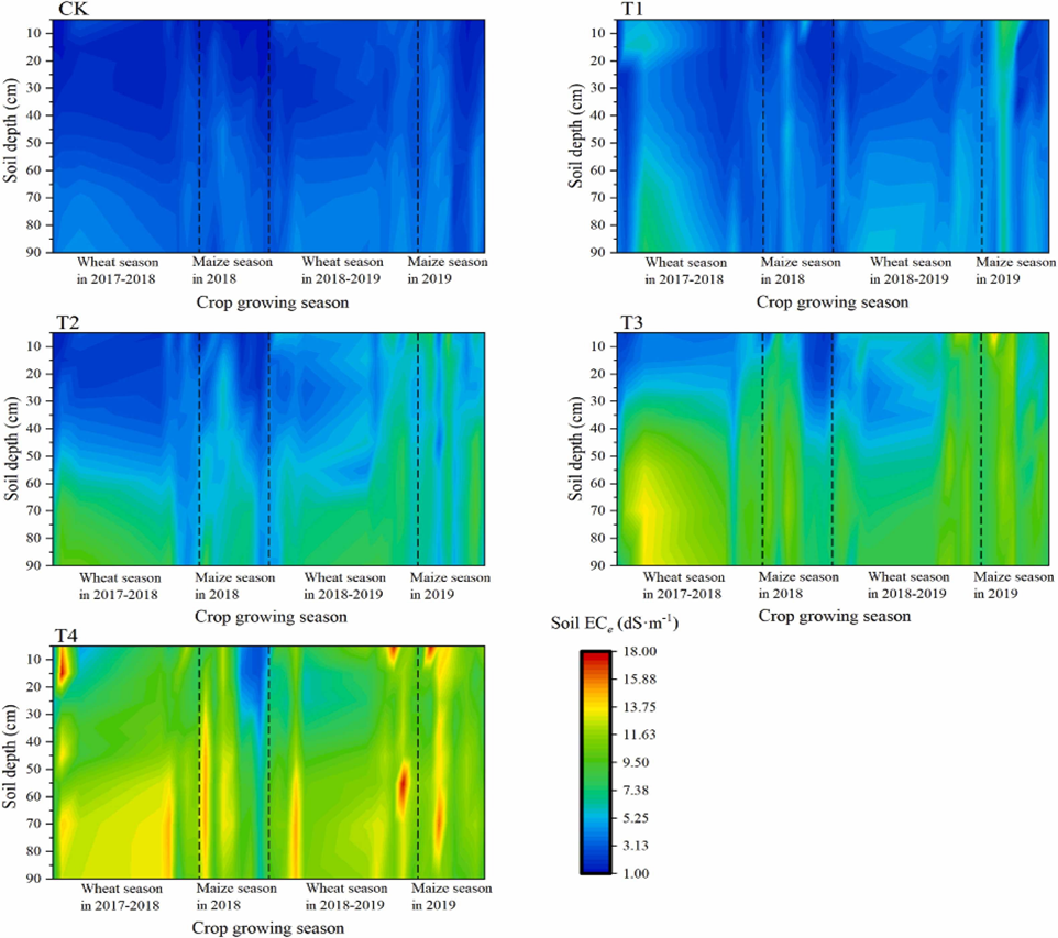 圖1. 作物生育期間不同灌水處理土壤鹽分剖面分布