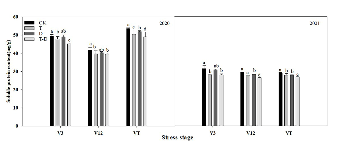 圖2 不同生育時期高溫、干旱及其復合脅迫對夏玉米可溶性蛋白的影響