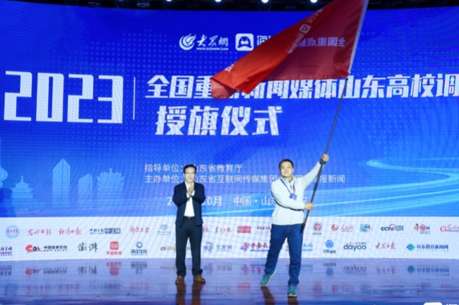 山東農(nóng)業(yè)大學(xué)黨委書記徐劍波出席發(fā)布會并致辭,向參加2023全國重點新聞媒體山東高校調(diào)研的媒體代表授旗。黨委副書記、校長冷暢儉主持發(fā)布會。