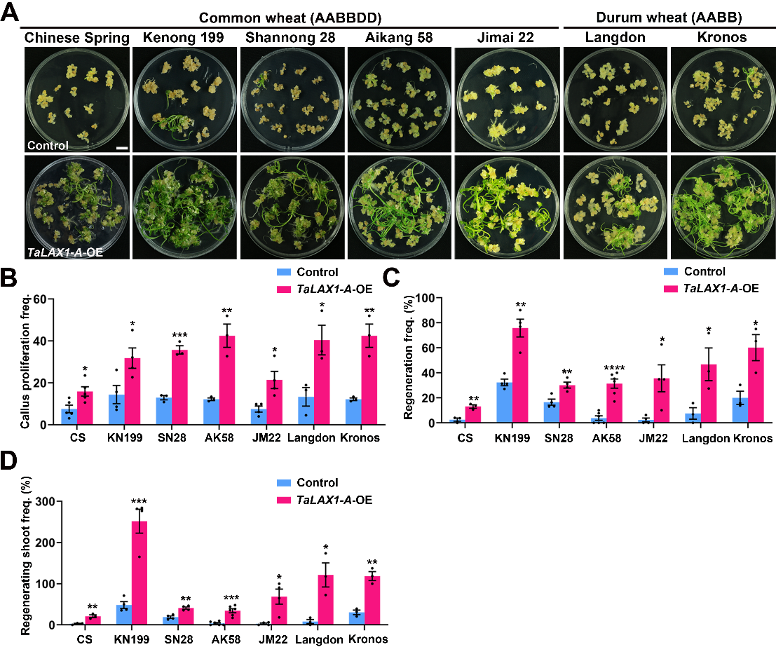 圖1.過量表達TaLAX1可以提高多個小麥品種再生能力