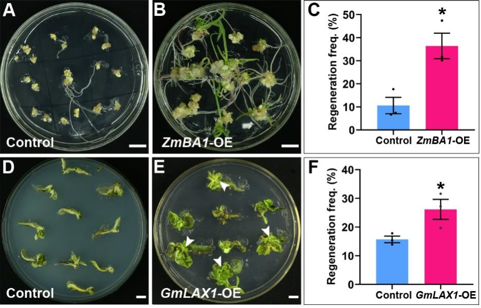 作者發現在玉米和大豆中過量表達TaLAX1的同源基因,存在保守的提高再生能力的效果(圖3)。