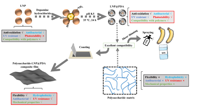 圖1. LNP@PDA增強多糖基薄膜性能的示意圖