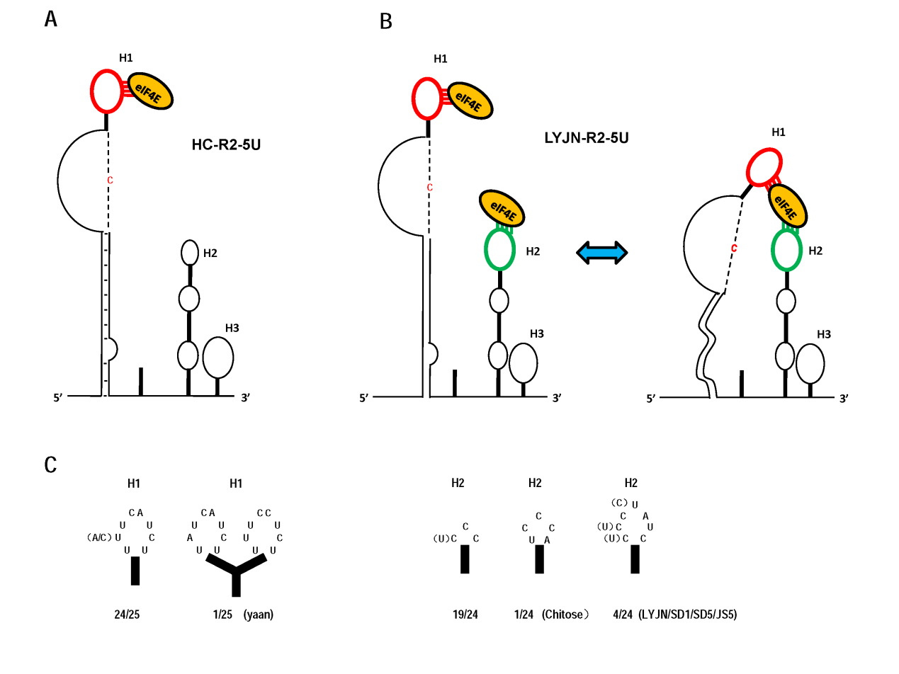 通過體外翻譯、RNA結構分析、突變分析、RNA與蛋白互作分析等,發現WYMV的HC分離物與LYJN分離物的RNA2均含有不依賴帽子翻譯元件IRES,但其活性相差7倍。IRES元件主要包含2個莖環H1和H2,在2個分離物的H1中均含有一個翻譯起始因子eIF4E結合位點,而LYJN分離物H2中還含有另一個eIF4E結合位點。在HC分離物與LYJN分離物的RNA2中含有不同數量的eIF4E結合位點,并且LYJN分離物RNA2中的2個eIF4E結合位點還存在協同效應,此協同效應由莖環H1的底部柔性莖來實現,使得位于莖環H1和H2中的eIF4E結合位點可以在物理位置上靠近(圖1)。