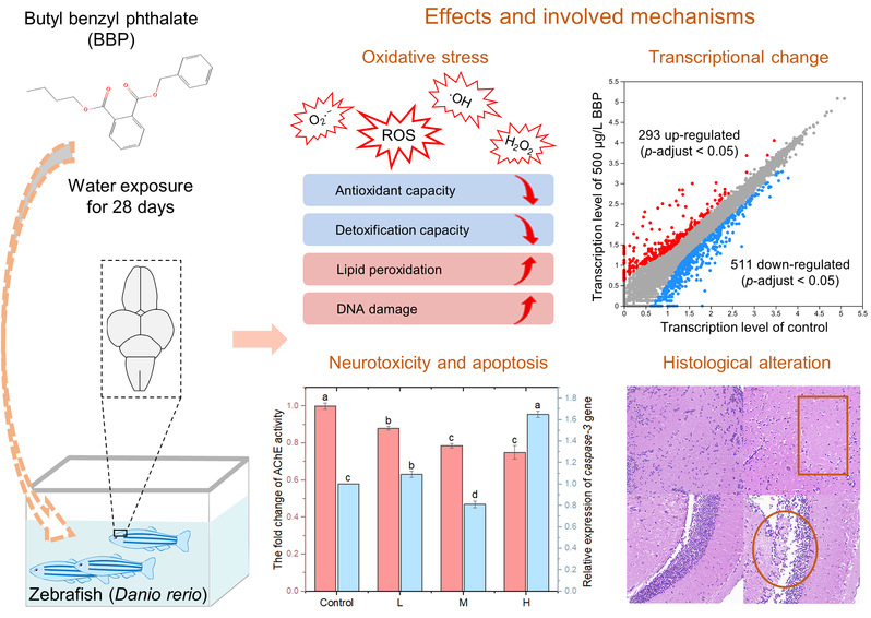 鄰苯二甲酸丁芐酯(BBP)是一類應(yīng)用廣泛的酞酸酯類增塑劑,目前已經(jīng)在各種環(huán)境介質(zhì)中被頻繁檢出,這引起了公眾的廣泛關(guān)注。本研究以成年斑馬魚(yú)(Danio rerio)為模式生物,分別從酶活性、基因表達(dá)和組織病理學(xué)等方面系統(tǒng)地解析了BBP對(duì)腦組織的生態(tài)毒理學(xué)影響。結(jié)果表明,BBP暴露能夠引起氧化應(yīng)激、神經(jīng)毒性和組織損傷,同時(shí)引發(fā)腦部轉(zhuǎn)錄組譜的改變,干擾補(bǔ)體和凝血級(jí)聯(lián)(Complement and coagulation cascades)以及兩種心肌病(Hypertrophic and dilated cardiomyopathy)相關(guān)通路的表達(dá)。