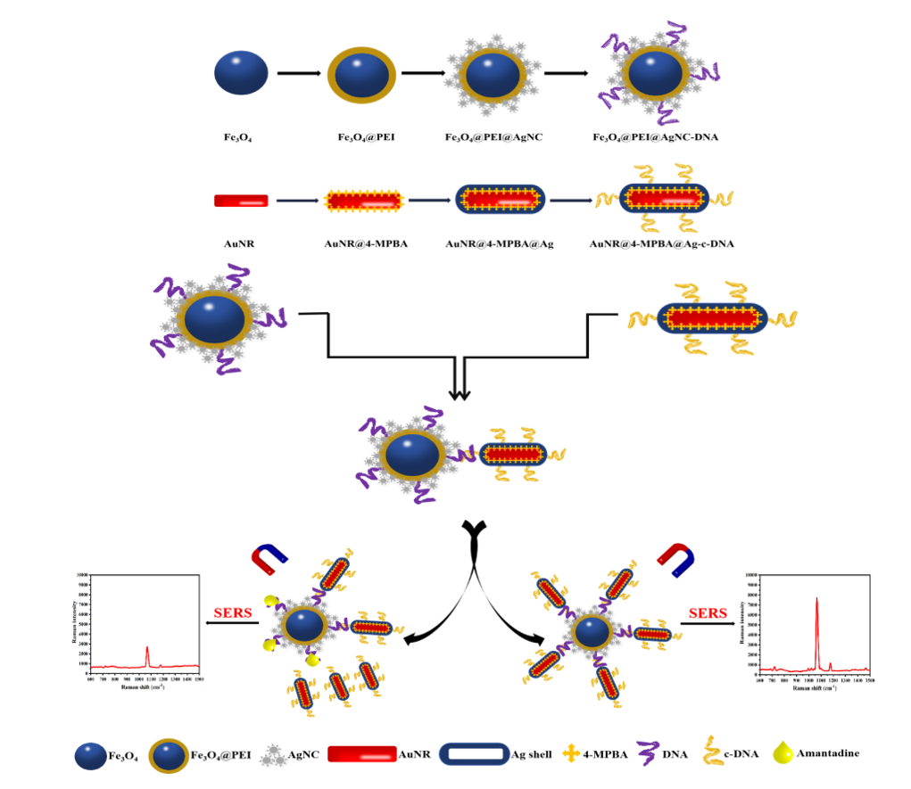 基于此,研究團隊基于Fe3O4@PEI@AgNC-apt為捕獲探針,AuNRs@4-MPBA@Ag-c-DNA為報告探針,研發了一種超靈敏、高選擇性的新型SERS適體傳感器,用于食品中金剛烷胺的檢測。捕獲探針的超順磁性、報告探針的間接拉曼信號以及適配體的特異性使得SERS適體傳感器方法提供了較寬的線性濃度范圍以及低的檢出限。這項工作表明,構建的新型SERS適體傳感器可以實現低含量金剛烷胺的檢測,并通過改變構建傳感器的適配體和互補DNA鏈的類型來實現對其他小分子的檢測。