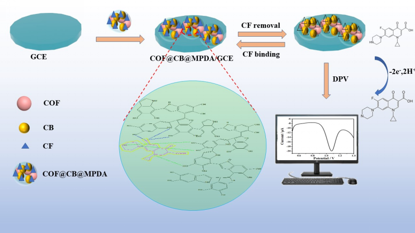 基于此,團隊以COF、CB為基體,多巴胺為功能單體,結(jié)合分子印跡技術(shù)研究合成了一種比表面積大、導(dǎo)電性能優(yōu)異且具有特異性識別作用的COF@CB@MPDA納米材料用于環(huán)丙沙星的高靈敏電化學檢測?;?a name="OLE_LINK1">COF@CB@MPDA構(gòu)建的傳感器對環(huán)丙沙星的檢測具有較寬的線性范圍、優(yōu)異的選擇性和較高的準確性。這項工作表明,COF@CB@MPDA在食品危害物的電化學檢測中具有廣闊的應(yīng)用前景。
