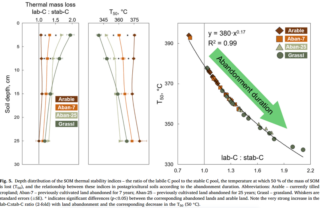 在世界范圍內,大面積的撂荒農田正在進行自然生態系統的恢復。撂荒農田的生態系統變化是由植被演替驅動的,并導致土壤及其功能的恢復。通過農業活動修復后農田增加了土壤有機碳和能量儲量。MAOM組分在碳封存中起關鍵作用,而fPOM是微生物群落的主要能量來源。在超過25年撂荒期的0-30 cm土層中,土壤每年積累0.85 Mg C ha-1,C儲存增加了1.5倍,活性SOM的能量儲存翻了一番。在25年的土壤恢復過程中,活性碳的積累速度是穩定碳的2.8倍。土壤熱穩定性下降是由于穩定碳積累速度加快和隨后微生物對穩定碳分解的刺激共同作用,使得撂荒農田土壤中碳循環加快。我們關于廢棄土壤中SOM熱穩定性下降的研究結果對于理解廢棄土壤重新轉化為農田時有機碳的潛在損失至關重要。