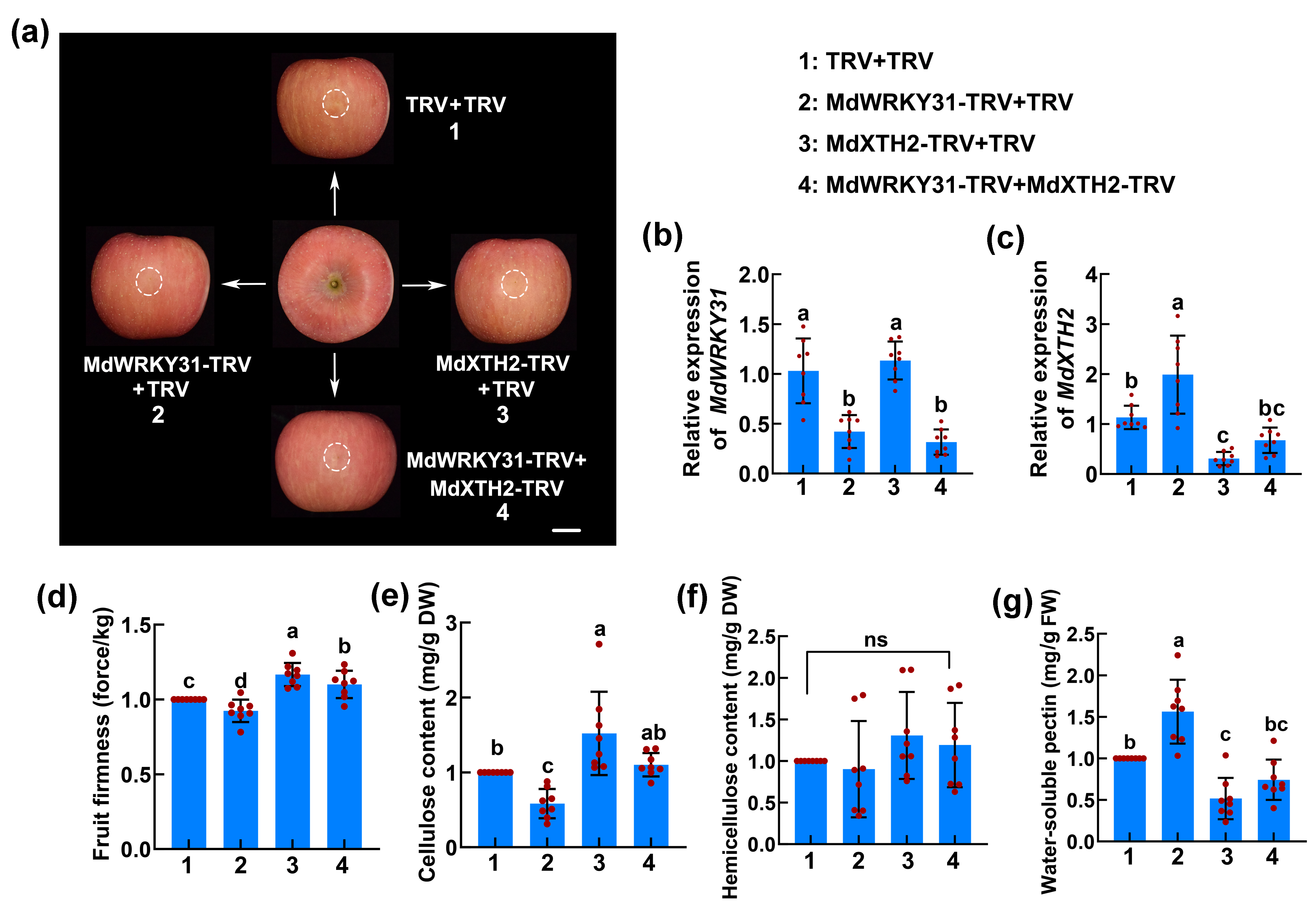軟化受一系列初生細胞壁修飾相關酶及編碼基因調控,包括多聚半乳糖醛酸酶(PG)、果膠裂解酶(PL)、木葡聚糖內糖基轉移酶(XTH)、擴張蛋白(EXP)等。研究人員基于團隊前期已獲得的蘋果轉基因植株,發現超量表達MdWRKY31可以引起蘋果植株細胞壁組分的變化,結合轉錄組測定和分子生化實驗分析,篩選到靶基因木葡聚糖內糖基轉移酶基因MdXTH2。通過蘋果果實瞬時表達實驗明確,MdWRKY31通過轉錄抑制MdXTH2表達維持果實硬度。