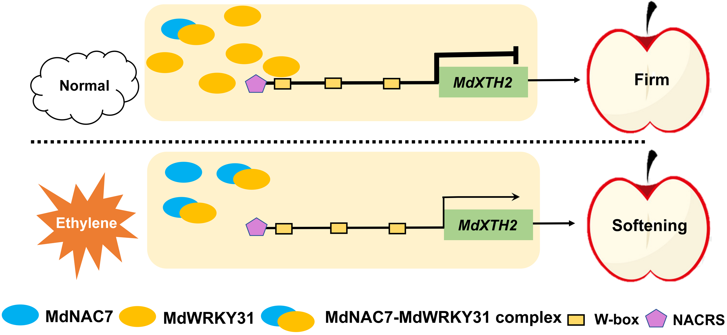 研究人員還發現,MdNAC7不能直接結合MdXTH2基因啟動子,但可以通過與MdWRKY31形成蛋白復合體,阻止MdWRKY31與MdXTH2基因啟動子結合,減緩MdWRKY31對MdXTH2的轉錄抑制作用,促進蘋果果實軟化。在此過程中,乙烯信號抑制MdWRKY31表達的同時,激活MdNAC7,從而直接和間接的促進MdXTH2表達,最終加速蘋果果實軟化。最終,該研究提出了MdNAC7- MdWRKY31作用模塊調控乙烯介導蘋果果實軟化的分子模型,為維持蘋果采后品質,延長果實貯藏期、貨架期和提升蘋果果實經濟效益提供新思路。