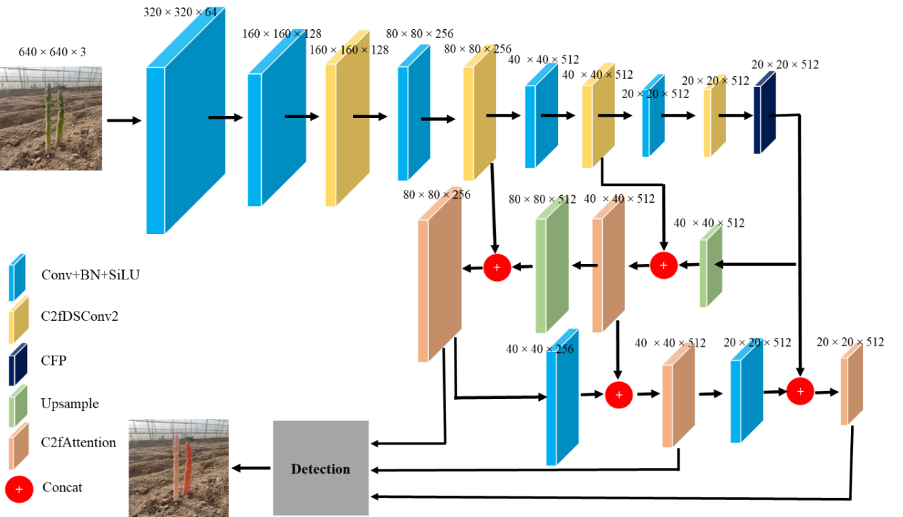 針對以上技術(shù)難題,山東農(nóng)業(yè)大學(xué)苑進(jìn)教授團(tuán)隊以大田種植的綠蘆筍為研究對象,首創(chuàng)了S2CPL綠蘆筍選擇性采收過程中采收適宜性評價和土下切割點精確定位的關(guān)鍵方法。該方法利用RGB-D傳感器獲取綠蘆筍的圖像和空間深度信息,對YOLOv8的實例分割算法進(jìn)行了研究和改進(jìn)提高分割精度,同時提出了一種利用圖像掩模融合深度信息計算綠蘆筍長度和直徑的三維形態(tài)提取方法,最終實現(xiàn)了機(jī)器人選擇性采收的收獲評價和圖下三維切割點定位。該項研究還建立了一種為機(jī)械化采收末端執(zhí)行器提供目標(biāo)點信息的相機(jī)位姿優(yōu)化方法。該技術(shù)有望為提高綠蘆筍選擇性采收中的視覺定位系統(tǒng)提供重要核心技術(shù),實現(xiàn)成熟綠蘆筍自動化、智能化采收,促進(jìn)綠蘆筍產(chǎn)業(yè)的發(fā)展。