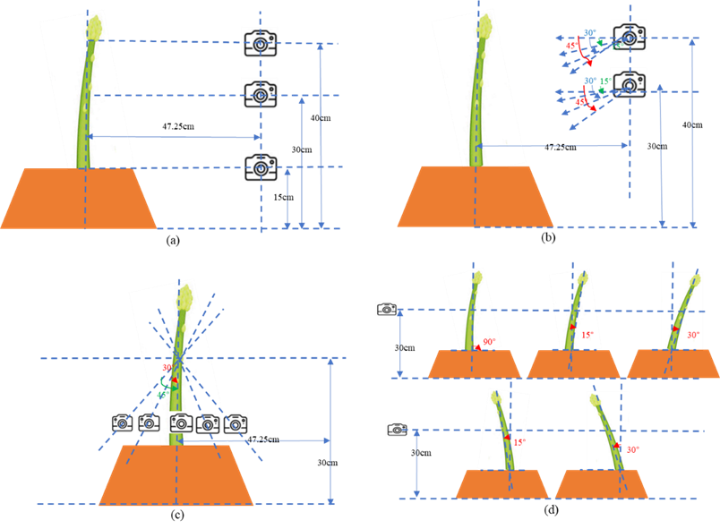 蘆筍是一種多年生宿根性草本植物,在20世紀(jì)80—90年代中國已成為世界上栽培面積最大的蘆筍生產(chǎn)國和產(chǎn)品出口國,面臨著收獲綠蘆筍的挑戰(zhàn)。蘆筍生長密集,同一根系生長出來的蘆筍嫩芽生長方向、生長成熟不一致,具有快速、零星生長的特點。目前全國幾乎所有蘆筍采摘等繁重的體力勞動仍由農(nóng)民人工完成,綠蘆筍的采收需要根據(jù)其長度仔細(xì)選擇成熟的莖,另一方面,我國蘆筍一般生長在山脊上,需要用蘆筍刀在地表以下1至2cm的深度人工切割,因此這是一項勞動密集型和耗時的工作。實現(xiàn)田間綠蘆筍智能選擇性采收的關(guān)鍵在于采收適應(yīng)度(長度、直徑等)的判別和綠蘆筍底土切點的精確定位。