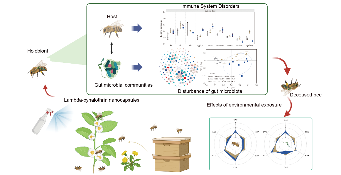 近日,學校蜜蜂科研團隊在《Journal of Hazardous Materials》發表了題為“The effect of lambda-cyhalothrin nanocapsules on the gut microbial communities and immune response of the bee elucidates the potential environmental impact of emerging nanopesticides” 的研究論文,揭示了納米高效氯氟氰菊酯(LC-NCs)通過宿主和腸道微生物群落對重要授粉昆蟲意大利蜜蜂的毒性作用機制。