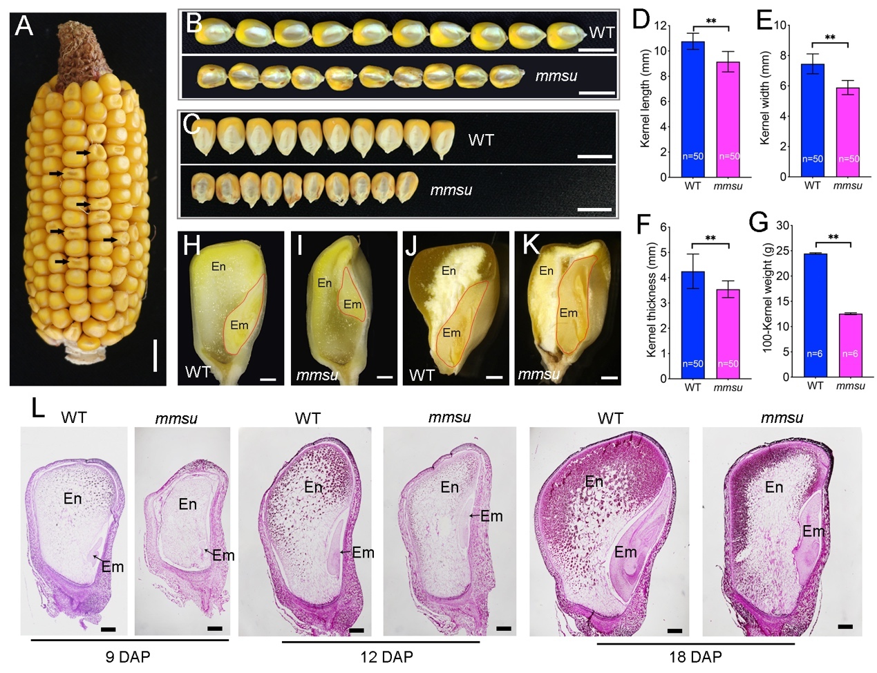 研究團(tuán)隊(duì)今年3月份在《Plant Physiology》發(fā)表的論文中鑒定到一個(gè)易感玉米瘤黑粉病且株高矮化的突變體maize mutant highly susceptible to U. maydis (mmsu),揭示了玉米ZmADT2基因在調(diào)控玉米植株發(fā)育及瘤黑粉病抗性方面發(fā)揮重要作用。在此基礎(chǔ)上,研究團(tuán)隊(duì)進(jìn)一步解析了ZmADT2調(diào)控玉米籽粒發(fā)育作用。研究結(jié)果表明mmsu籽粒籽粒變小,百粒重降低,胚和胚乳發(fā)育遲緩,籽粒中淀粉積累和蛋白含量減少,胚乳中生長素含量降低,胚乳細(xì)胞面積減小。基因表達(dá)譜分析顯示,mmsu籽粒中營養(yǎng)積累和生長素信號(hào)通路受影響。外源施加生長素可以恢復(fù)mmsu籽粒發(fā)育遲緩的表型。以上結(jié)果表明,ZmADT2介導(dǎo)的生長素信號(hào)在玉米籽粒營養(yǎng)積累和發(fā)育中起著重要作用。