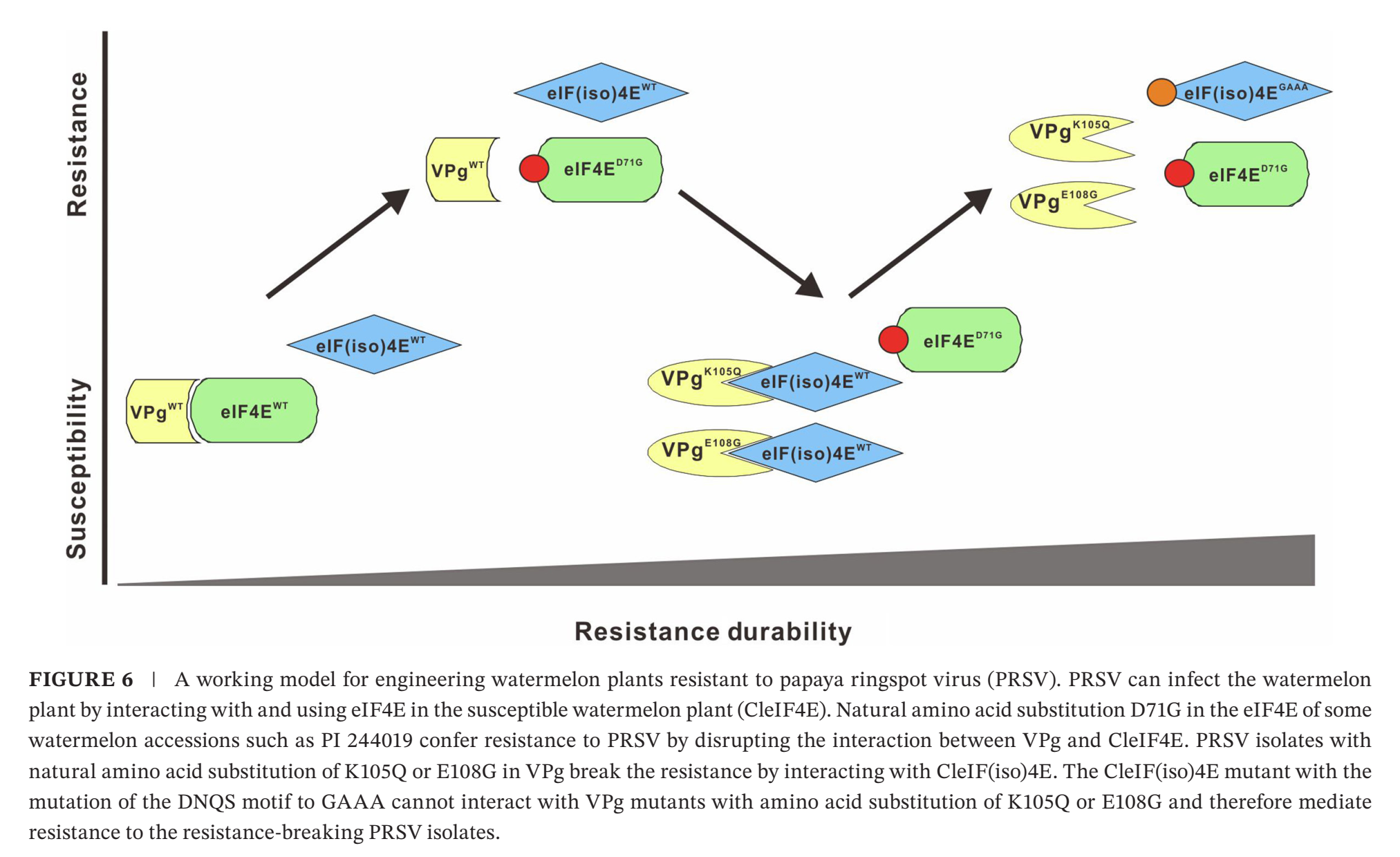 在本研究中,李向東/耿超團隊發現,番木瓜環斑病毒-西瓜株系大多數分離物VPg第105位和第108位的氨基酸分別為賴氨酸和谷氨酸,但是個別分離物VPg第105位氨基酸是谷氨酰胺,或者第108位氨基酸是甘氨酸,它們不能與西瓜抗病品系的eIF4E-G71互作,但可以與西瓜抗病品系的另外一種真核翻譯起始因子eIF(iso)4E互作。也就是說,這些分離物不能利用eIF4E-G71,轉而劫持eIF(iso)4E,使其成為新感病因子,從而克服西瓜抗病品系的抗性。團隊還發現,新感病因子eIF(iso)4E的四個氨基酸產生突變后,就不再與第105位氨基酸是谷氨酰胺,或者第108位氨基酸是甘氨酸的VPg互作,進而介導對番木瓜環斑病毒-西瓜株系所有已知分離物的抗性。