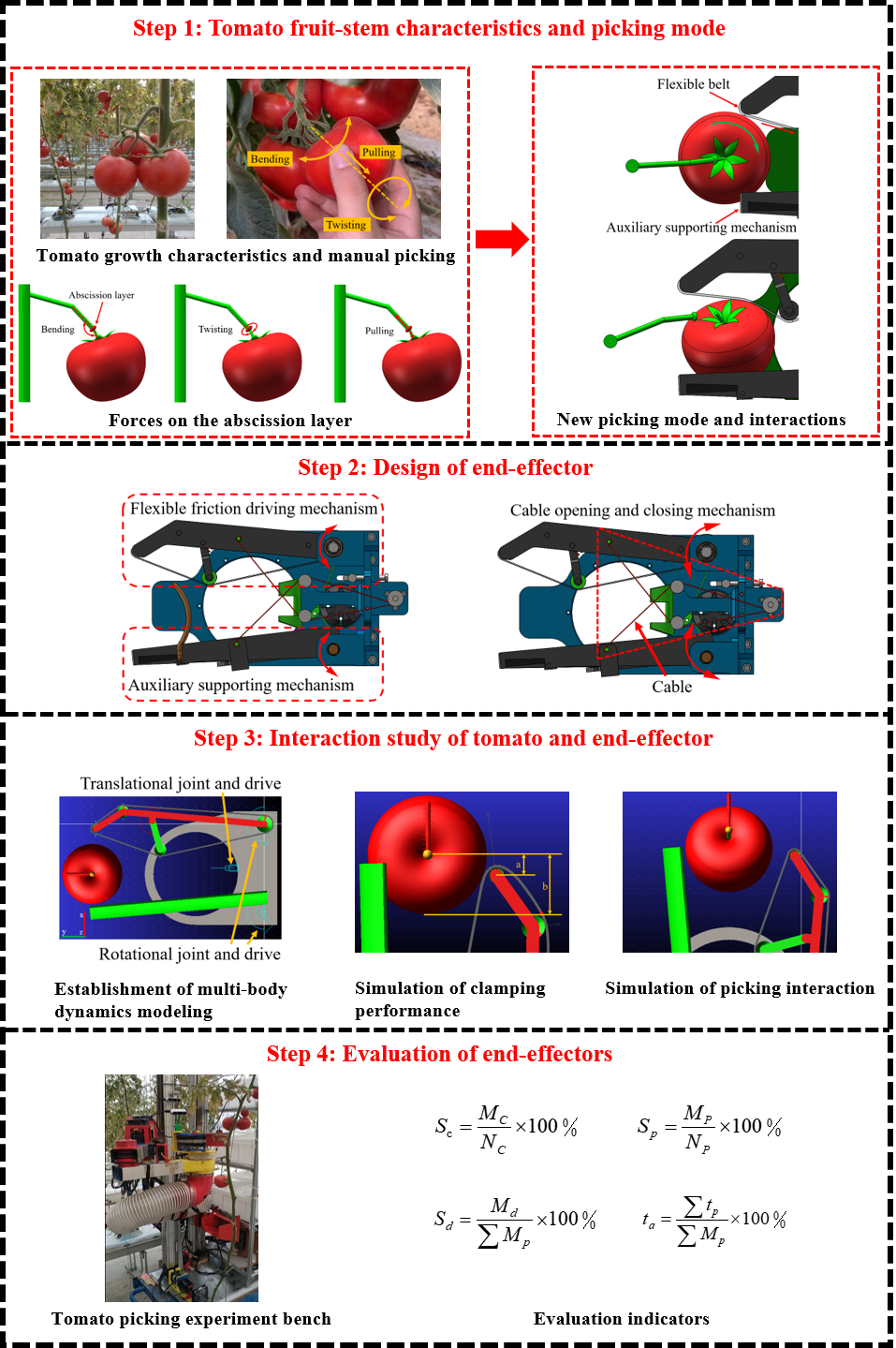 近日,機電學(xué)院苑進教授團隊在《Computers and Electronics in Agriculture》,發(fā)表題為“Design and interaction dynamics analysis of a novel hybrid bending-twisting-pulling end-effector for robotic tomato picking”的最新研究成果。博士研究生方家明為論文第一作者,機電學(xué)院苑進教授和劉雪美教授為共同通訊作者,辛振波副教授、戴念祖博士生參與課題研究,我校為唯一通訊單位。