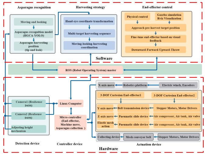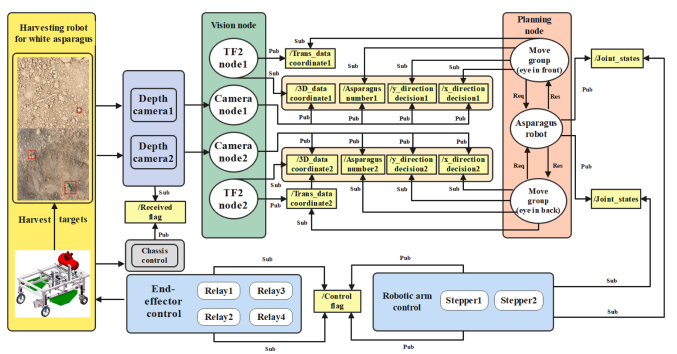 針對以上技術難題,山東農業大學苑進教授團隊提出了一種選擇性采收過程中筍芽識別、機械臂運動、末端執行器采收即“走-看-采”協同的控制策略以及雙機械臂區域獨立的高效采收協同算法,研究了基于ROS的多機械臂選擇性采收智能控制系統,進行了軟硬件系統集成、調試及優化,提高了作業效率,降低了漏采率。