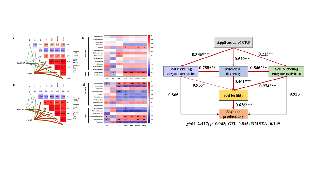 本研究通過兩年田間試驗(2023-2024年),結合16S rRNA和ITS測序技術和結構方程模型(SEM)解析了施用控釋磷肥對土壤微生物、土壤氮-磷循環酶活性、土壤肥力和大豆生產力的影響及其相互作用關系。結果表明,施用控釋磷肥增加了土壤細菌和真菌群落多樣性及有益微生物(Bradyrhizobium,Lysobacter,Sphingomonas和Flavisolibacter)的相對豐度,提高了土壤氮、磷循環酶的活性。在土壤微生物和養分循環酶的作用下,土壤肥力和大豆生產力得到提高。其中,大豆產量提高1.7%~12.9%,大豆磷肥利用效率提高1.1~22.5個百分點。研究結果為磷肥高效利用和大豆可持續生產提供了理論依據和積極貢獻。
