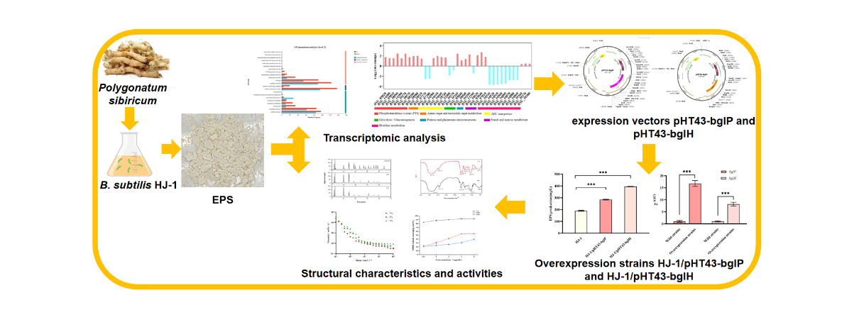 基于此,團隊研究聚焦于一株從泰山黃精中分離的內生菌——枯草芽孢桿菌(Bacillus subtilis)HJ-1,對其產生的胞外多糖的結構及特性進行分析,結果表明HJ-1胞外多糖與黃精多糖相似,且其體外抗氧化能力優于黃精多糖。通過轉錄組學研究深入解析其合成機制,鑒定出一系列與胞外多糖合成相關的基因,其主要涉及單糖運輸、核苷酸糖合成、多糖聚合、運輸和調控等關鍵代謝途徑,明確了其體內多糖合成的分子機制;并進一步利用代謝工程手段對參與核苷酸糖的合成過程中兩個關鍵基因(bglP、bglH)進行同源過表達,其胞外多糖產量分別比野生型菌株提高了150%和210%,這一研究成果綜合利用了代謝工程、系統生物學、合成生物學等技術,為工廠化生產具有黃精多糖活性的內生菌代謝產物提供了技術支撐,具有重要的經濟和社會價值。