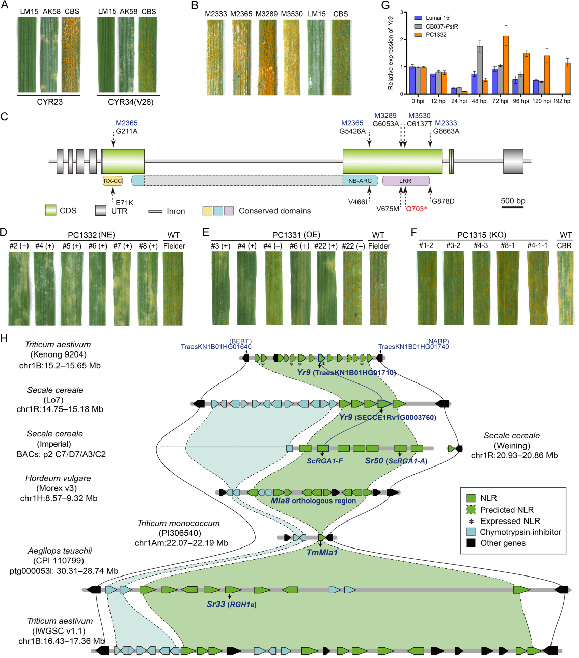 研究人員對“魯麥15”開展了抗條銹病遺傳分析,通過最近開發的突變體分析技術STAM(Sequencing Trait-Associated Mutations)(Ni et al., Nature Communications. 2023),鑒定到一個候選基因,編碼NLR(Nucleotide-binding Leucine-rich Repeat)抗病蛋白。通過自然表達、過量表達、基因編輯等多種方法證明了該基因即為黑麥來源、在生產上被廣泛利用的抗條銹病基因Yr9。研究人員還發現Yr9位于一段大約400 Kb的抗病基因簇,其中包含至少14個NLR基因。該基因簇在不同物種中具有良好的保守性,并分化出多個針對不同病害的抗病基因,包括在大麥中發現的既抗大麥白粉病也抗小麥條銹病的基因Mla8、在一粒小麥中發現的抗白粉病基因TmMla1、野生祖先種節節麥來源的抗稈銹病基因Sr33,黑麥中發現抗稈銹病基因Sr50等。研究結果不但解析了1BL/1RS易位系材料抗條銹病的遺傳基礎,而且為Yr9基因的分子育種應用以及新基因挖掘提供了重要參考。