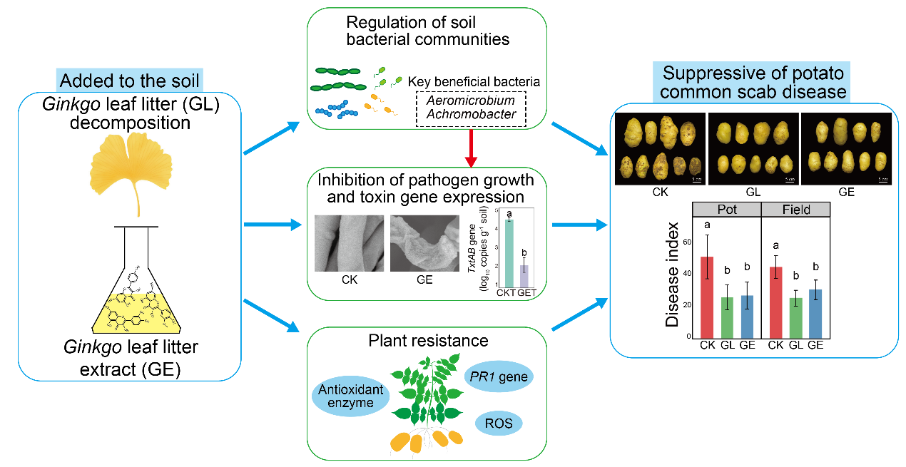 近日,山東農業大學生命科學學院高崢、周波教授團隊在Journal of Environmental Management發表了題為“Progressing towards eco-friendly agricultural management: Utilizing Ginkgo bilobaleaf litter for potato common scab control”的研究論文。