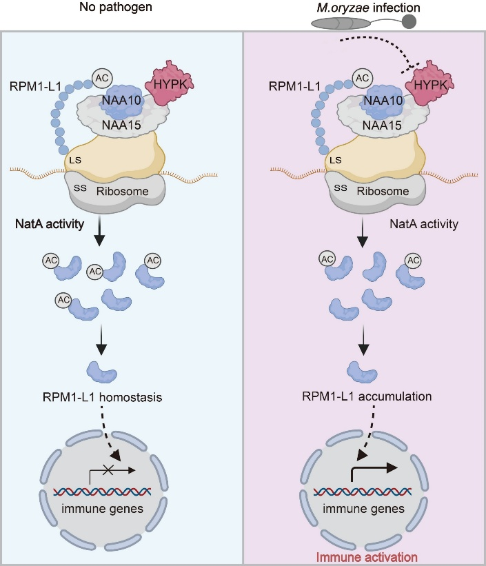 OsHYPK/NatA-RPM1-L1平衡水稻生長與抗病的工作模型